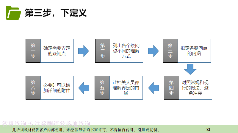 制定一份高质量的绩效量表是各级管理者的必备的关键技能,也是管理者有效发挥下属工作能动性的关键措施。制作绩效量表实际上也反应了管理者给下属提要求和定标准的能力,具体如何才能有效地为下属提出符合岗位需求的工作要求呢?可以遵照如下六个步骤完成绩效量表设计: